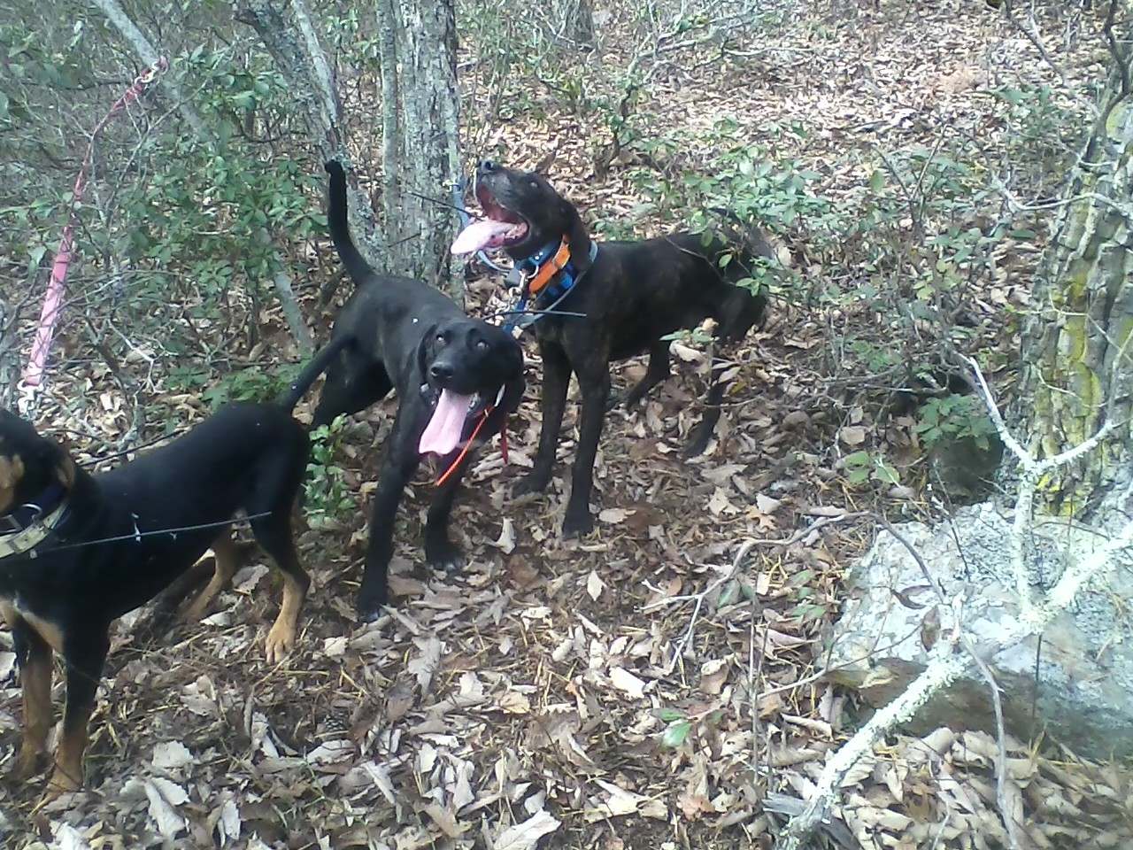 Heres my next two lead dogs. A mistake litter. Out of a friends dogs that have made my best dogs on theyre best days look mmediocre. Some more freebies; Thunder is the blue male. Black Ears (sons pick and named) is the white female. Love that color! Theyre six months and making races and treeing. The male bayed his first bear at 5 months and was doing his share of face barking. On one long race yesterday the female came out at the tree an hour after it treed, by herself. whereas three older dogs im running were way outran and just turned around and were picked up where i struck. Pretty happy with them so far