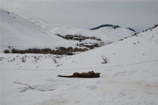This was just a 1/4 mile out of the City Limits. There was a cow elk carcass about 50 yds. uphill that probably attracted both the wolves and the cat to the area. It is not officially confirmed yet but looked to F&G as if the wolves had killed the cat. This was the same cat that was on Lon Stickney's porch and F&G took to Little Wood Reservoir and turned loose not to long ago.
