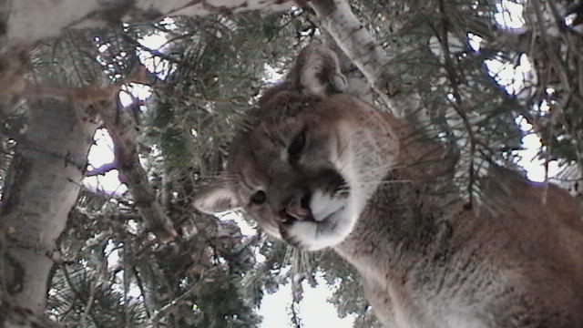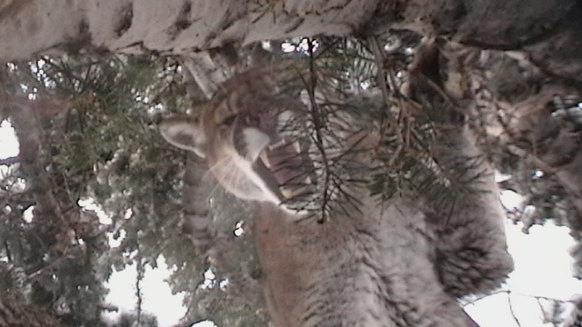 He called me at 6am and said that he cut a snowed in track. He went home, went to church, ate lunch. By 1pm he decided the lion had a good enough head start and kicked a few culls out to see what would happen. Nada peep......trailed the track into the bears head and then they started to make some music. A long hike later and there was a runt of a tom in a tree. He did have a few battle scars on his nose that made him look cool.