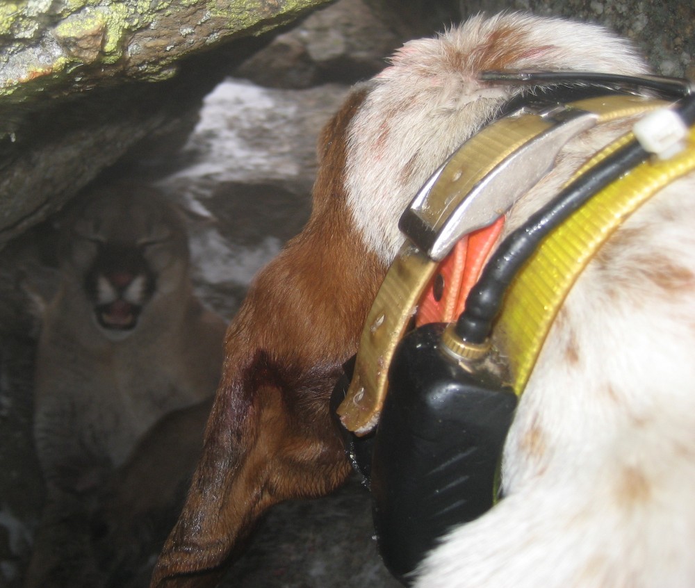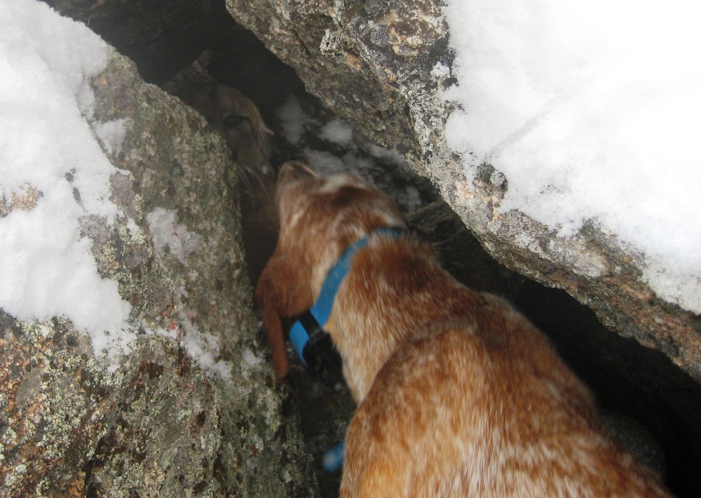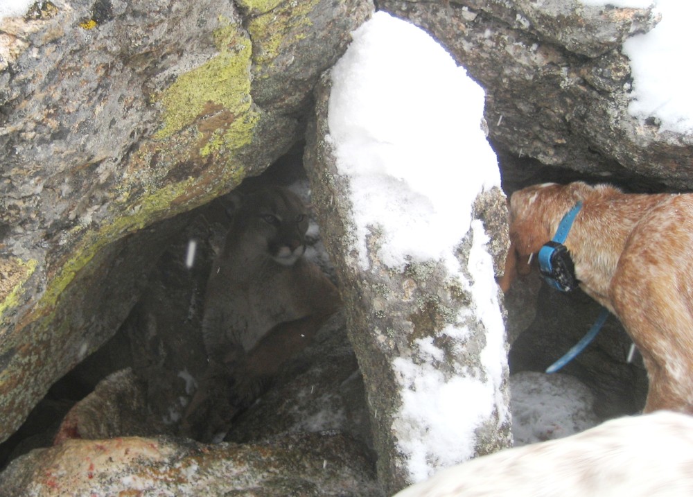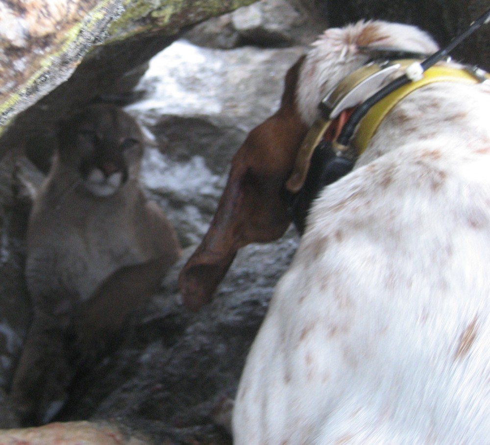 Got out on Saturday after a tough night in the saloon and the hunting gods were good, and bad to me. Found a track and roaded the dogs into it,the pups fired on it first and started moving it up the hillside and before long they were moving it on one twisted trail. After a bit the track lines out towards some ledges and the dogs were gone. I think they had her bayed up for some time while we were headed in, and then I saw the cat running down below us with the dogs not to far behind. She ran over into a rock pile and they had her, with both pups hammering away like they knew what they were doing. Just as we walked up I heard the maylay happen and one of the pups come running out shaking her head. I pulled the dogs out of the hole snapped a couple quick pics and got out of there. Only after getting down to the truck did I realize the damage and headed for the vet. $900.00 dollars later and a few good pics, and I'm down for a few weeks. Can't catch a break even when I'm doin good.