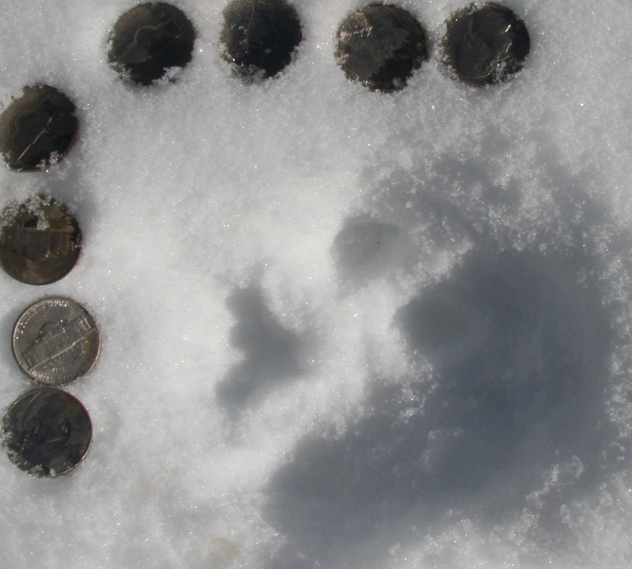 The first pic is of a big tom we have put out on 4 times and he is still roaming the hills. We put out on him again this morn and yet he got away again. We got him pretty well patterned now, his time is coming. I had a bunch of nickels so I put them next to his track about 3 inches. After we lost that battle we went across the drainage and chased this younger tom and tree'd him.