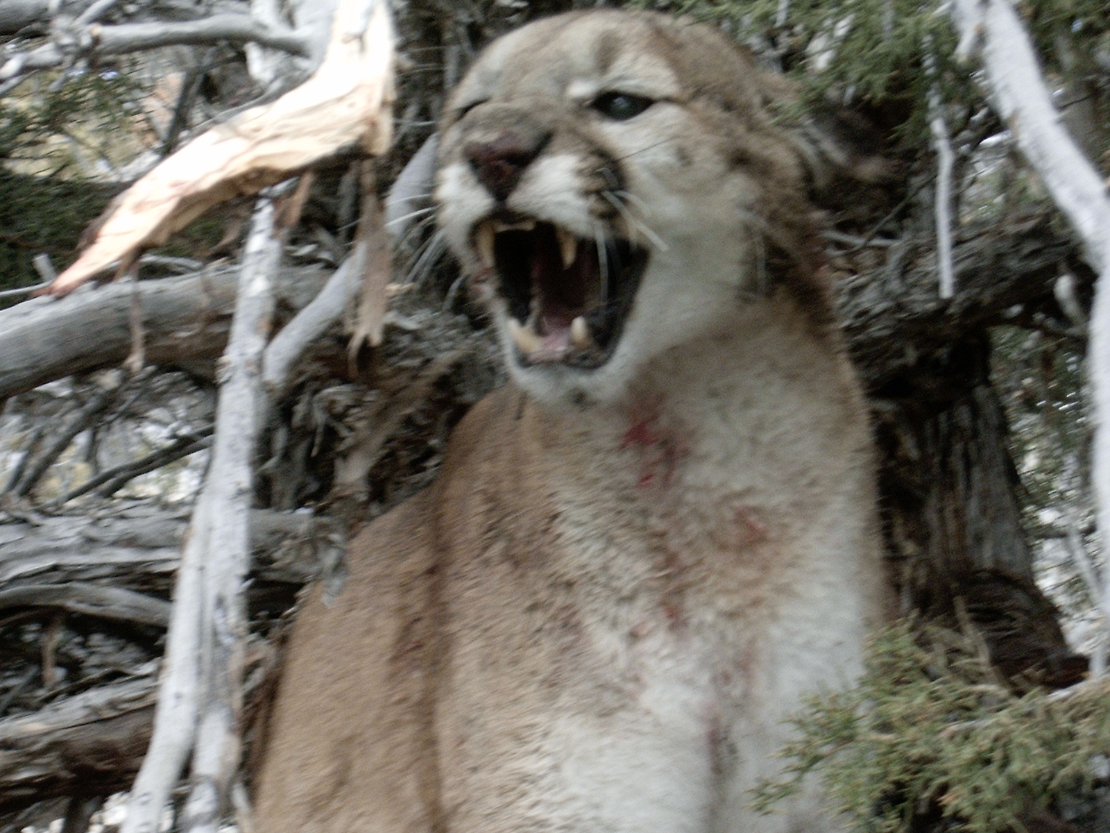here are some pics of a lion cal bryant and i caught on 4-6-10 it was a good day turned out on a female track lost it in the rockes found a track while walking out that came out of the same rock pile and it wasnt there when i walked in.had to drop off the ridge and gather up my clyde dog and meet cal like planned.. i drove the road to see if the track crossed and it didnt so i headed up the ridge that i had found the track on 100 yds from the road i seen a flash out of the corner of my eye and the dogs went nuts and were gone i seen the lion running up the next ridge with my clyde dog and cals scrouge do right on its tail they went out of sight but my garmin showed them treed a mile away well i got half way there and the lion jumed and was heading twards me the dogs ran trough the bushes right by me and headed down the canyon.. cal was a bit behind me and ran into the dogs witch had the lion bayed on the ground he let three more dogs go the cat tore up some dogs and had a attitude it was a good day......