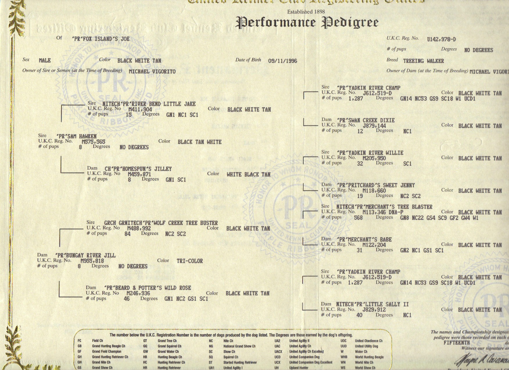 This is my 13 yr. old dog's pedigree.he is the best beardog and reproducer ive ever had.in my opinion it is yadkin river champ tree blasters sire that makes the difference .
