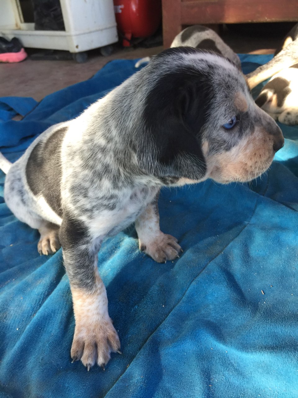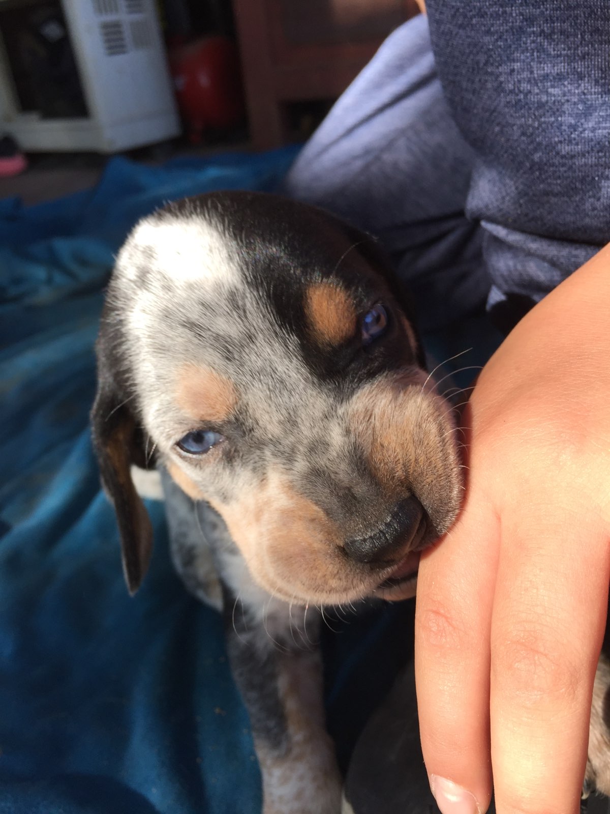 Sure, all true hounds have brown eyes and true hound colors. It’s impossible to get, off colored eyes without the merle gene and true hounds do not have the merle gene. So, if you have, let’s say blue color cow dog, mixed with a bluetick hounds and then continue, for several generations breeding the bluetick in and the cow dog out, before long, it would go unnoticed and look like a bluetick. That is, until either by years of inbreeding or just by chance something from another breed like the blue eyes, just shows up. The merle gene is inherited as an autosomal, incomplete dominant trait. The merle gene causes patches of color or a solid coat or blue or odd colored eyes. Cryptic merle hounds do not appear to be merle, but contain the merle gene. Solid color dogs are cryptic, like Leopard cur, now called Leopard hounds. You can breed two solid color Leopard hounds and get a mixed litter with both solid and merle littermates. The merle gene alters color and modifies eye, nose and pads on feet color. The merle gene modifies causing random modifications to the pigment of the eyes, occasionally changes dark eyes to blue, one eye or only part of the eye. Hounds that do not present the merle genotype can produce merle offspring and are also known as cryptic merles, they do not appear to be merle, just produce those traits.