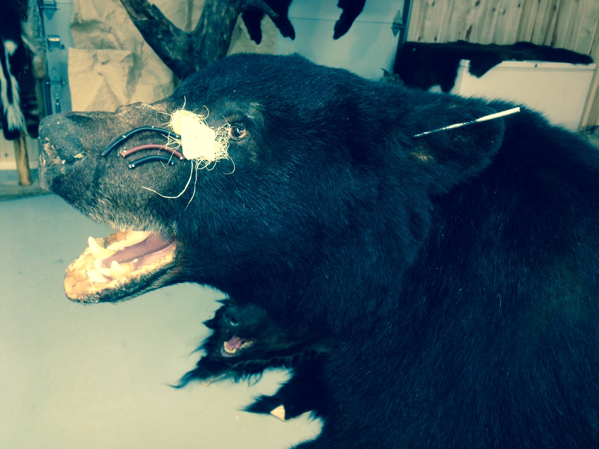Next up are the feet. I added clay up into each toe and figured out how much additional clay I would need in each foot to make for a seamless transition to where the form ended. A small cut was made where the bolt would go through the bottom of the foot, then the glue was added to the inside of the hide and slipped onto the form. I then got started on the sewing. I've read that it takes over 1800 stitches for a lifesize bear. I got both front feet sewn up and just got started down the belly. Noon, break for lunch.