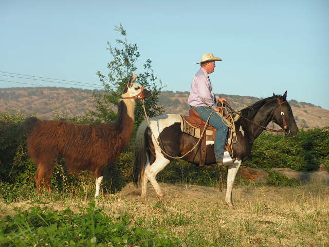 A few more pictures. My brother on a young colt teaching him to trust his rider. My brother on that problem mare taking the neighbors llama for a walk. and last that Cowboy water skiing on that problem mare.