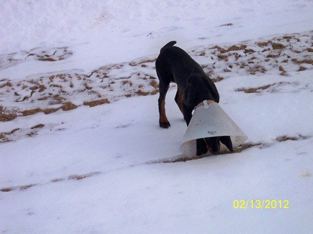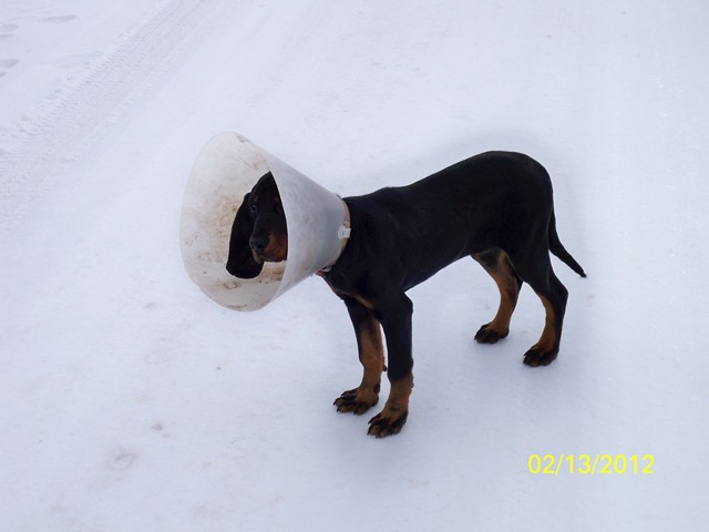 Wouldn't ya think in this day and age they would come out with something that works better than this? I feel sorry for her, damn thing catches on everything. It's gotta stay on for 14 days. BTW, she had an operation on her right eye for cherry eye.