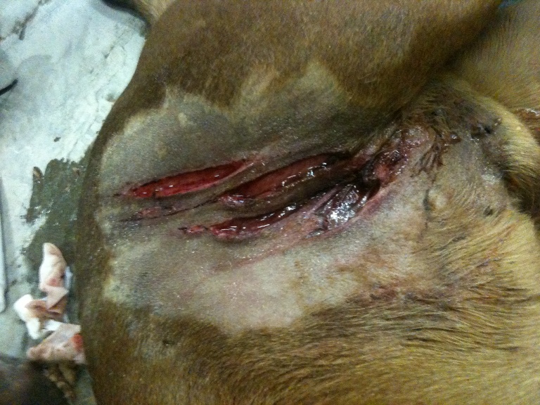 Last cat we chased was a female, after we got to there she stayed treed for a few minutes then jumped, all the dogs were fine when they lit out after her....I beeped them to come back which eventually they did and my lead dog had this battle wound, he's healing up fine though, should be 100% this weekend.....And that Oger is a majestic, he's still young but he is coming along great, has lots of drive, trees decently, and being huge has his disadvantages but I like the looks of him.