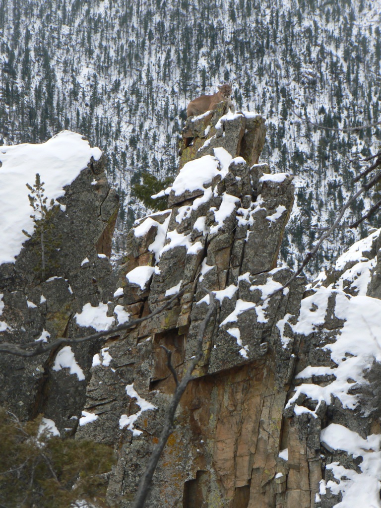 Didn't get any pics of the dogs on this particular cat. The dogs were in the avalanche shoot behind where the cat was bluffed. There was no way a dog could get up on that pinnacle, hell I was suprised the cat got up in that spot. Shortly after that cat spotted us he got up to bail so I had my friend shoot quickly. The shot looked good but you could tell there was a fight going on down below after the cat fell. By the time I got to the dogs the cat was pretty well dead, but I could see one dog suffered a bite that fractured his skull into his sinus cavity above his eye. Anyways here is a couple pics of the Jagds on a different tree