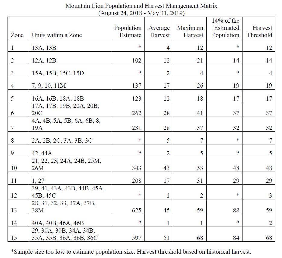 The Department recommends removing all mountain lion seasons with multiple bag limits. The annual bag limit statewide is recommended at 1 mountain lion per licensed hunter per calendar year. The Department recommends that regulated mountain lion harvest be managed through the use of 15 management zones which will consist of one or more biologically similar game management units. The total number of mountain lions that may be harvested (harvest thresholds) will be established by management zone. When a harvest threshold is reached in a management zone that zone will close to mountain lion hunting for the remainder of the season. The mountain lion season will run from August 24, 2018 through May 31, 2019.